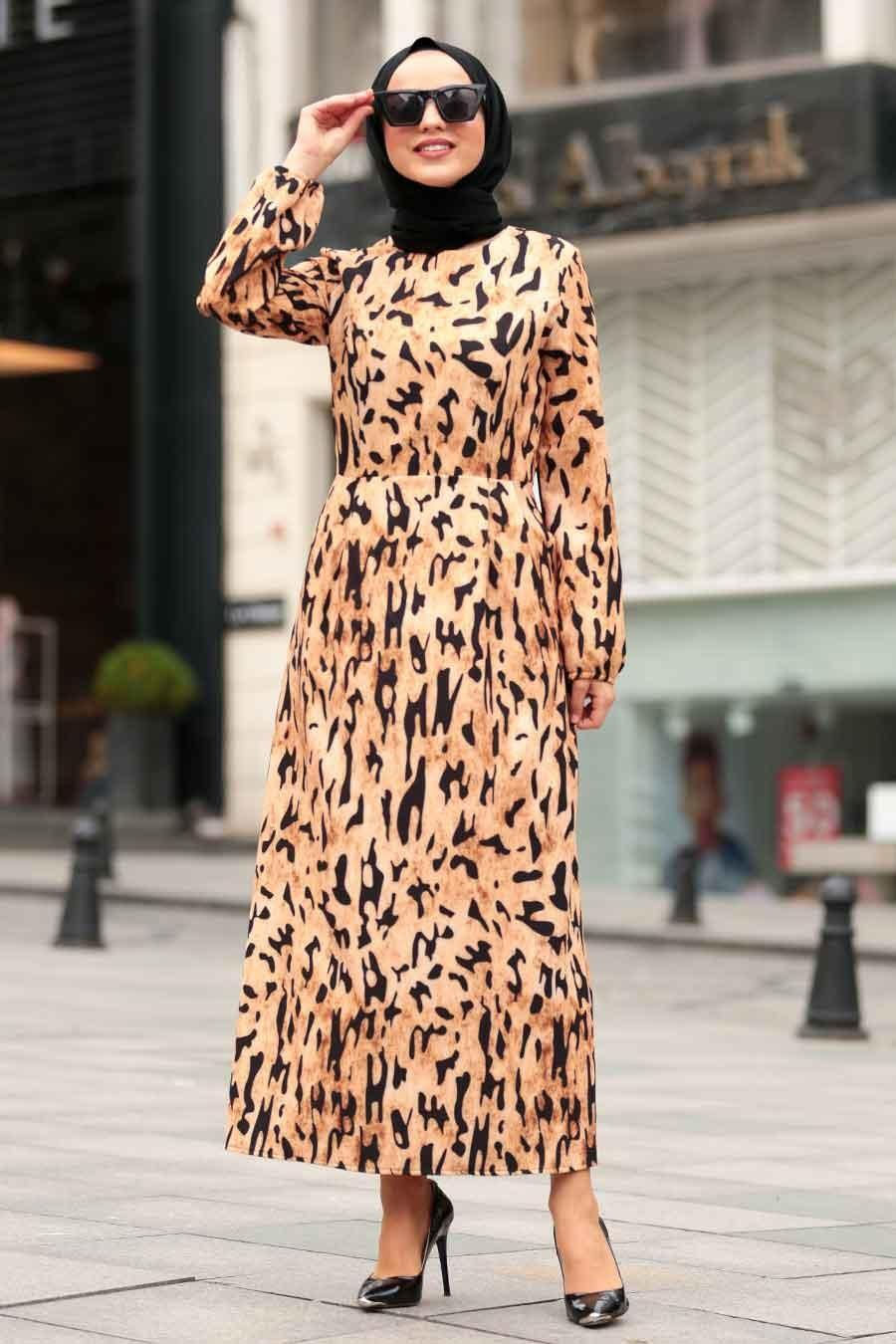 فستان محتشم رمادي مزخرف بستايل فهد نسائي